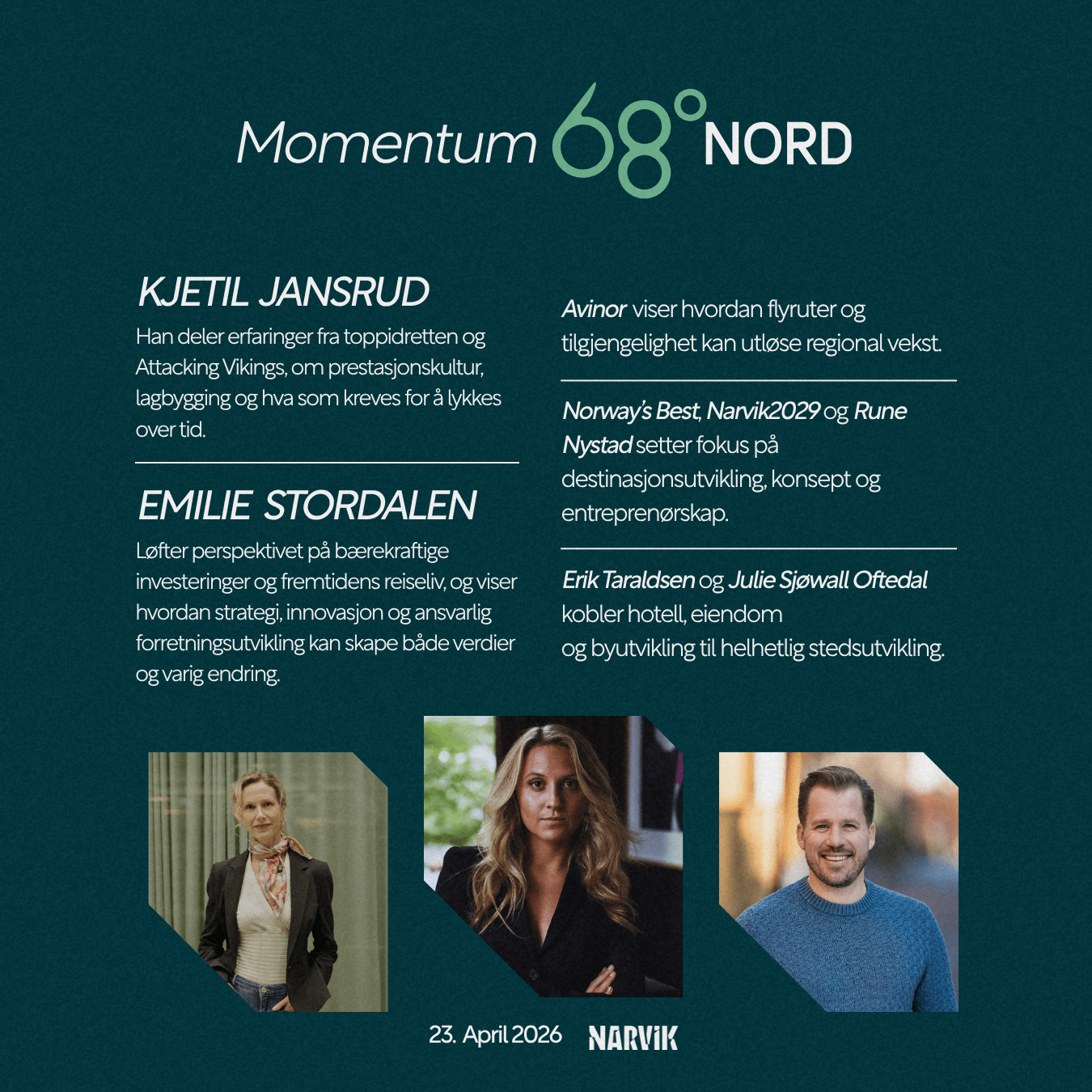 På Momentum 68° Nord samler vi næringsliv, beslutningstakere og drivkrefter for å dele innsikt, erfaringer og perspektiver som faktisk betyr noe.
